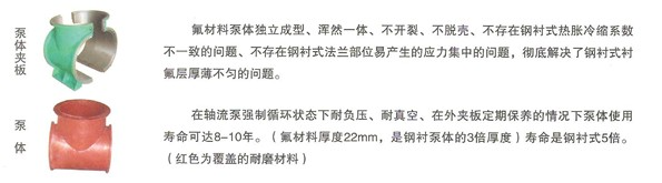 该泵采用特殊工艺烘熔、模压而成,其中钢衬复合泵泵体衬氟厚度10mm以上,夹板式泵泵体氟厚度25mm以上,并在氟内壁上进行特殊处理。