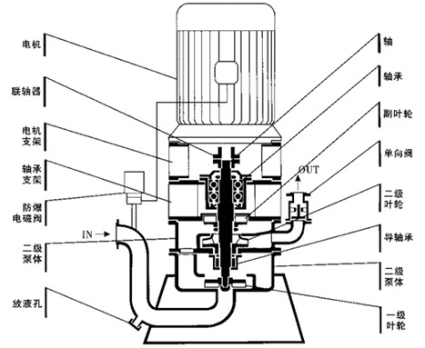 1.立柱,2.锁紧并帽,3.工作叶轮,4.泵壳连接座,5.蜗壳,6.泵轴,7.锁紧并帽,8.密封轮盖板,9.密封座,10.密封叶轮,11.泵壳出口法兰,12.支架,13.电机,14.联轴器,15.垫片A,16.垫片B,17.电动空气阀,18.耐磨环,19.泵壳进口法兰,20.泵体,21.锥体,22.泵壳吸口法兰,23.泵壳连接板,24.底板。