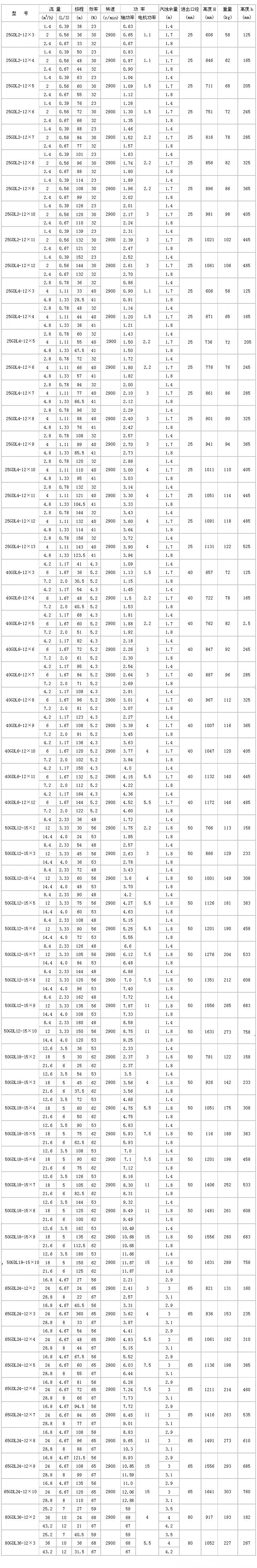 流量:2-160m3/h;扬程:24-200m;功率:1.1-90kw;转速:2900r/min;口径:φ25-φ150;温度范围:-15-+120℃;工作压力:≤2.5Mpa。